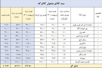 جمع کل قیمت سبد کالابرگ در اردیبهشت ماه ۱۴۰۱ مبلغ ۴۳۹ هزار و ۶۸۰ تومان بوده که اکنون به نرخ روز ۸۴۶ هزار و ۶۱۰ تومان رسیده و مابه التفاوت آن حدود ۴۰۷ هزار تومان افزایش را نشان میدهد.